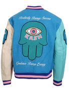 KASH CHENILLE PRINT VARSITY JACKET - BLUE W/PINK